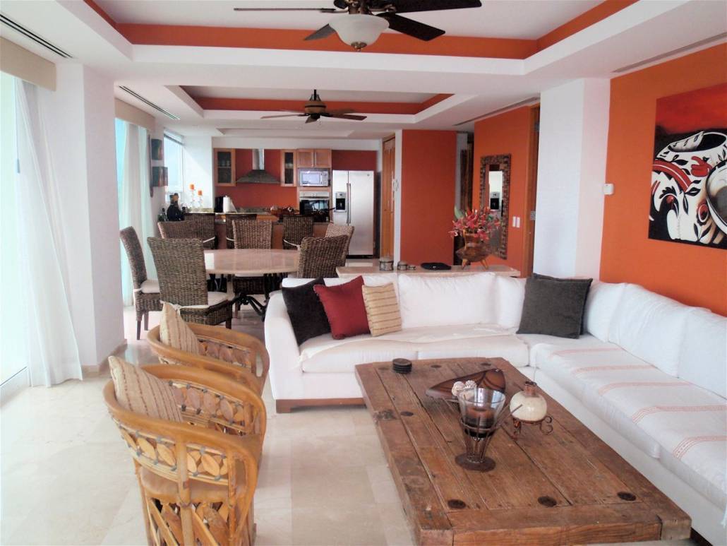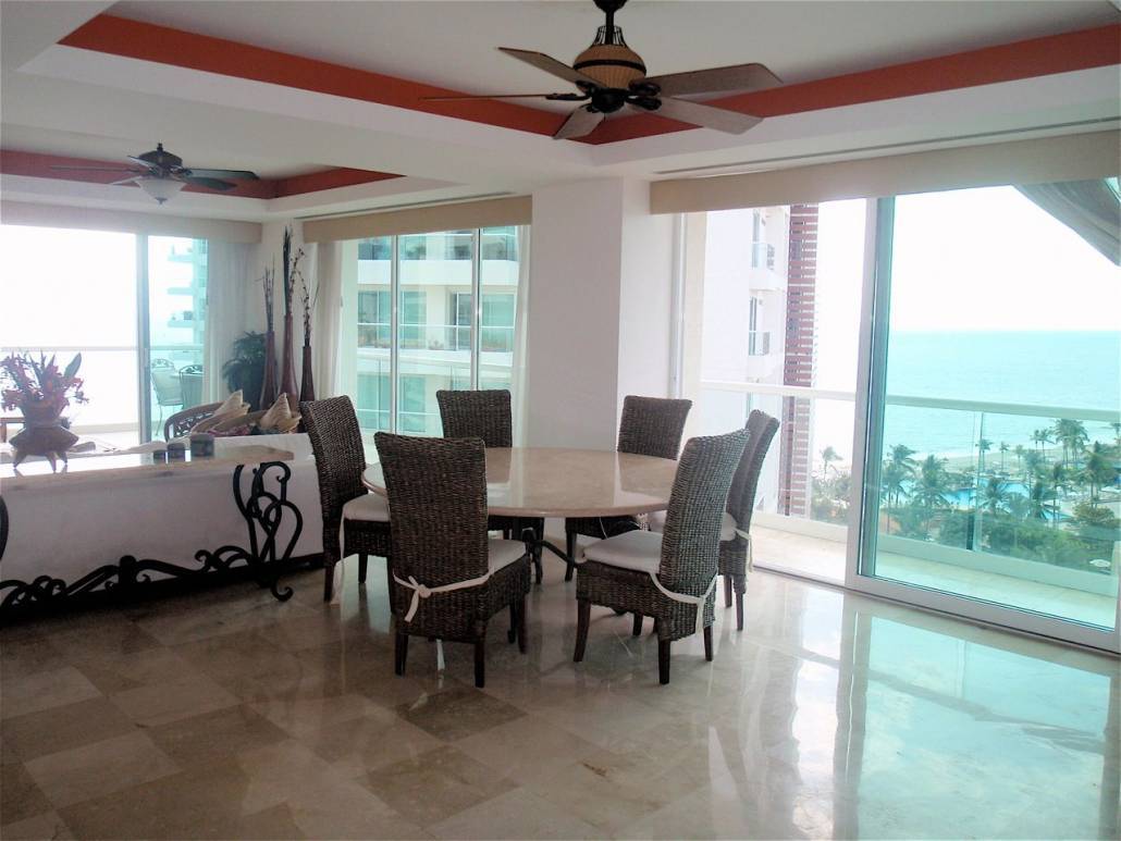 Three bedroom, three bath condo in Marina Vallarta, fully equipped and ready for you to enjoy paradise. From the wrap around balcony of this 12th floor condo you will watch the cruise ships sail into port in the morning and sail out to sea in the evening. You can enjoy a beautiful view of Downtown Puerto Vallarta to the South, spectacular sunsets to the West and Nuevo Vallarta to the North. This condo has been up- graded to create the most desirable three bedroom residence in Shangrila. The furniture features a beautiful. Each bedroom includes a king or queen size bed. Decorative ceiling fans circulate the air in each room. The kitchen has a built-in oven, wolf counter top stove (5 burners), large micro-wave, side-by-side refrigerator/freezer. It comes fully equipped with pots & pans, dishes, glass ware, and silver ware to serve 8. The laundry room includes front load washer and dryer. Other features include underground parking, locked storage area, private elevator, ready to use phones and wireless internet, intercom phone to the the full time doorman. Daily trash pickup. When you move into this condo you only need to bring your clothes and some groceries, open your favorite bottle of wine, sit back, and enjoy your new Puerto Vallarta home.